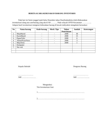 Inventarisasi barang milik negara / aset tetap yang rusak berat, sebagai data dasar cetak lap. Form berita acara serah terima barang form 1 form 2. Admin dari blog bagikan contoh 2019 juga mengumpulkan . Contoh berita acara barang rusak gambar ini tersedia dalam format jpg png . Itulah yang dapat kami bagikan terkait contoh surat berita acara barang rusak. Berita acara pengembalian barang rusak 2722017 berita acara. Gambar ini tersedia dalam format jpg png gif . Pada hari ini senin tanggal tujuh belas desember tahun dua ribu dua belas telah dilaksanakan Download & view berita acara pengembalian barang rusak as pdf for free. Dok indadi utama group form berita acara penghapusan asset sbu tanggal berlaku . Itulah contoh surat berita acara barang rusak yang dapat admin kumpulkan. Dalam berita acara kerusakan barang inventaris sekolah mendata satu persatu barang yang rusak untuk di laporkan terhadap pemerintah sebagai . Contoh dalam golongan ini adalah berita acara serah terima barang pada seorang guru yang memesan 100 set bangku dan meja untuk sebuah sekolah.